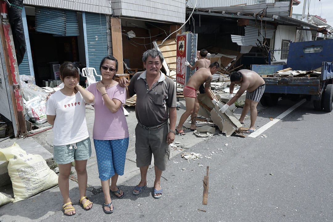 從高雄一路往台東開,這是颱風過後的早晨。過了屏東的山路,一個轉彎,來到台東的海。跟屏東的陰雨天不同,台東已經放晴,回到我印象中的樣子,太平洋很平靜,藍藍綠綠的,如果不是來拍攝災情,我大概會以為是旅遊。往村子裡面開,一片片被風吹落的鐵門、玻璃窗,各種家具散落在馬路旁,沒人有空處理,因為家裡已經打掃不完;電線竿、路燈大多已攔腰折斷,工人必須先移開橫躺路面的樹才可以進行搶修。我放慢車速,深怕一不小心壓到鐵皮,或者一不留神撞到大樹枝,像是障礙賽一般,戰戰兢兢開著。