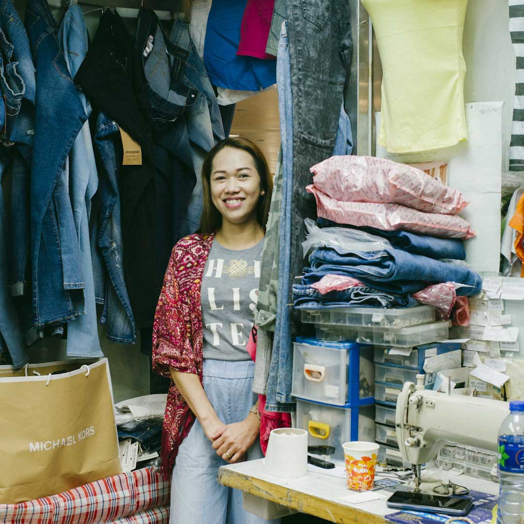 二樓的 Alteration 服裝店,由菲律賓女商人 Len Santiago 和丈夫共同經營。店外售賣便宜的T恤,10元到15元就能買一件,店內則有大量牛仔褲,59元、69元,若大小不合適,還可以即場改衣。店裡櫃子中有至少15種顏色的紡線。