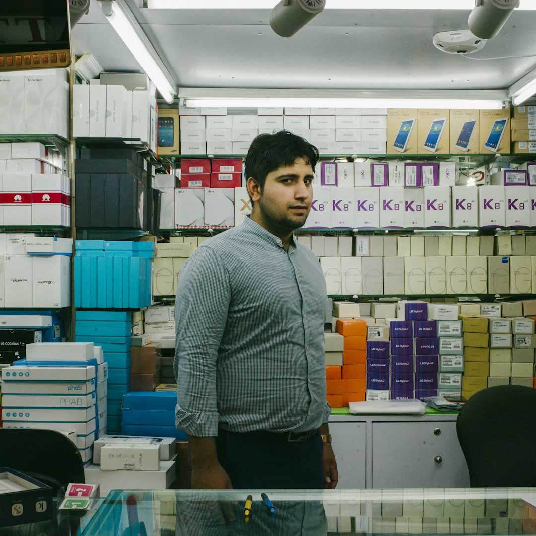 三樓另一側的 My Phone PTI 是環球大廈生意最興旺的手機店。店長 Khan Waqas 是在巴基斯坦出生的菲律賓人,幾年前進入環球大廈。針對菲傭的手機價格便宜,從300元到3000元都有,日韓品牌較多,最特別的是,可以無抵押、不須擔保人,在半年內分期付款。一款二手的韓國智能手機是店裡最熱銷的產品。