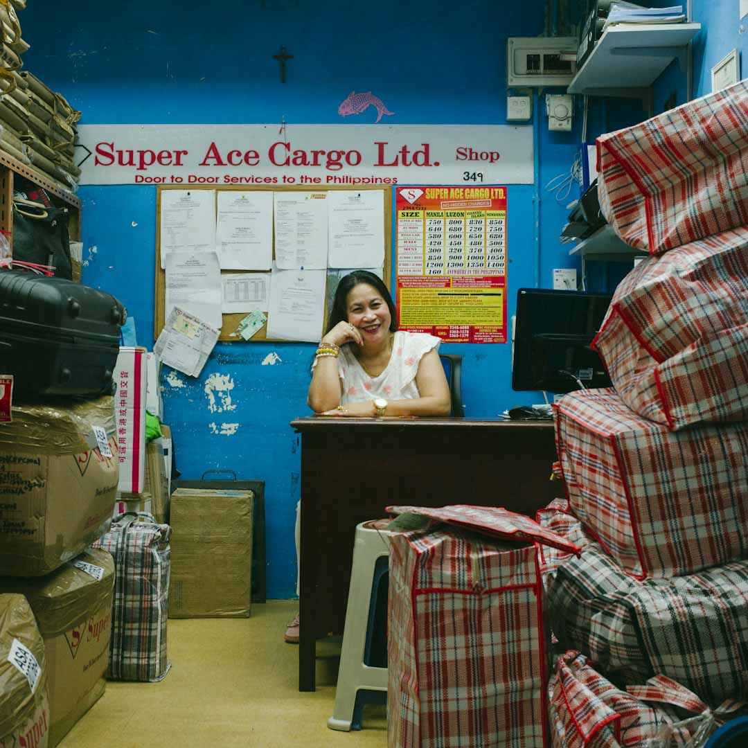 三樓的 Super Ace Cargo 是一間貨運店,是環球大廈幾十間貨運店中的一個。店長 Helen 在1992年來到香港,做了三年菲傭後與尼泊爾丈夫結婚,轉型到環球大廈做貨運管理,一做就是20年。環球大廈幾乎所有貨運店都按紙箱數量收費,費用從160元到1500元不等,若寄到菲律賓最南的棉蘭老島,一個月可達。