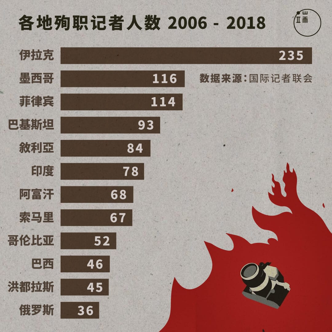 截至2018年4月,总共有32名新闻工作者丧命,相比去年同期的丧命人数多出三倍,情况令人忧虑。 2017年共有82名新闻工作者丧命,为十年内死亡数字最低的一年,大多集中在战祸地区,当中12名于阿富汗,11名于伊拉克,10名于叙利亚。