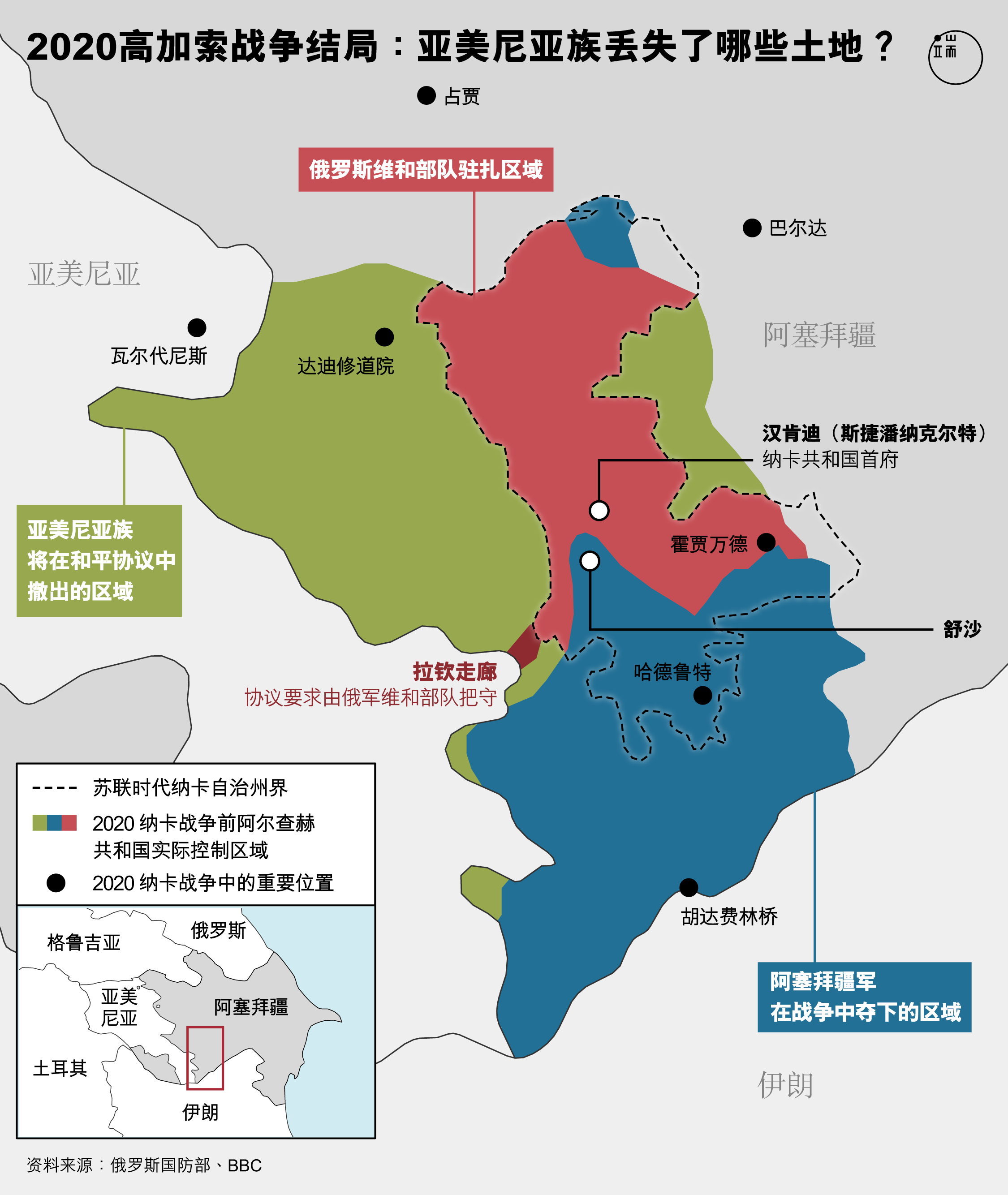 1980年代末,纳卡问题重现,占当地人口四分之三的纳卡亚美尼亚人要求加入亚美尼亚,苏联解体后战争全面升级。纳卡武装以少胜多,在1994年实现停火后,除自治州外还占领了周边大片阿塞拜疆领土。战争导致双方数万人死亡,一百多万人沦为难民。