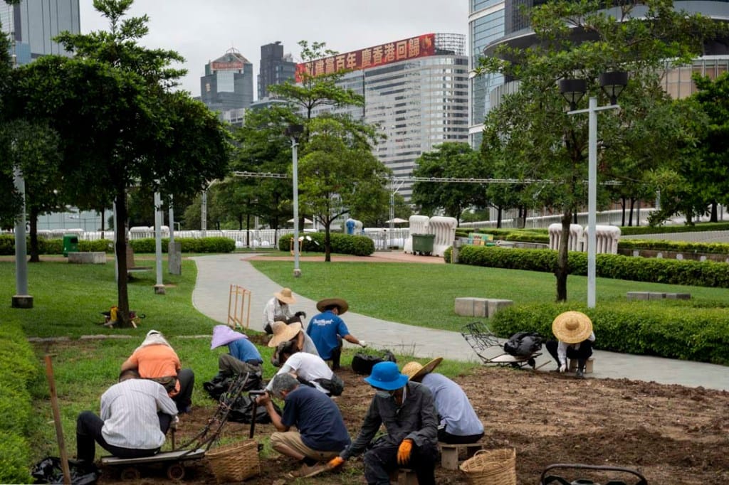 金鐘添馬公園內,香港各界慶典委員會舉辦「光影3D耀維港」表演,擺設燈飾及播放立體燈光片段,約有60人在表演開始前已帶同國旗排隊輪候。「賀建黨百年、慶香港回歸」,這兩個過往少有並稱的口號,在國歌聲中奏合。今年是香港主權移交24週年,恰逢中共建黨百年之日,在港區國安法生效後的香港,建制力量開始愈加強調中共在香港的角色和地位,身兼全國政協常委、香港各界慶典委員會主席的譚錦球早前在報章撰文指,「香港需要向港人、向海外講好中國共產黨不斷發展『一國兩制』、佑護香港繁榮穩定的故事。」