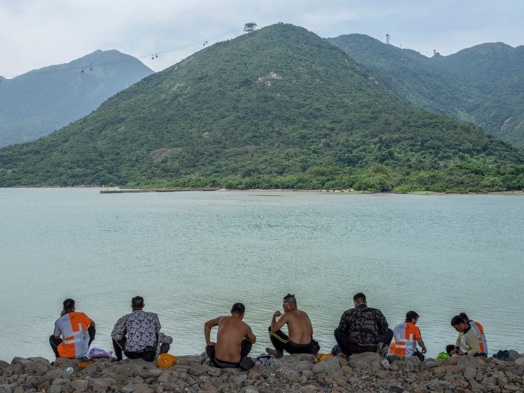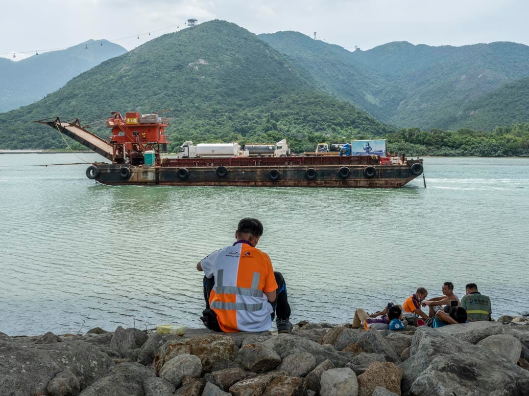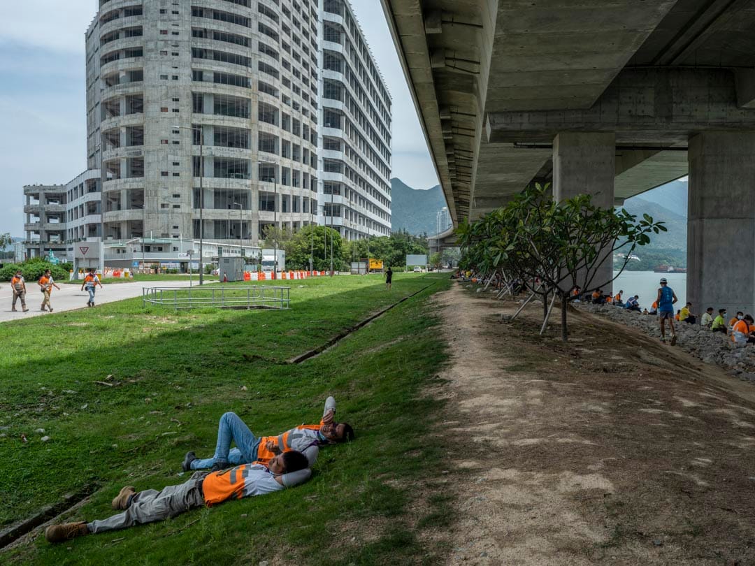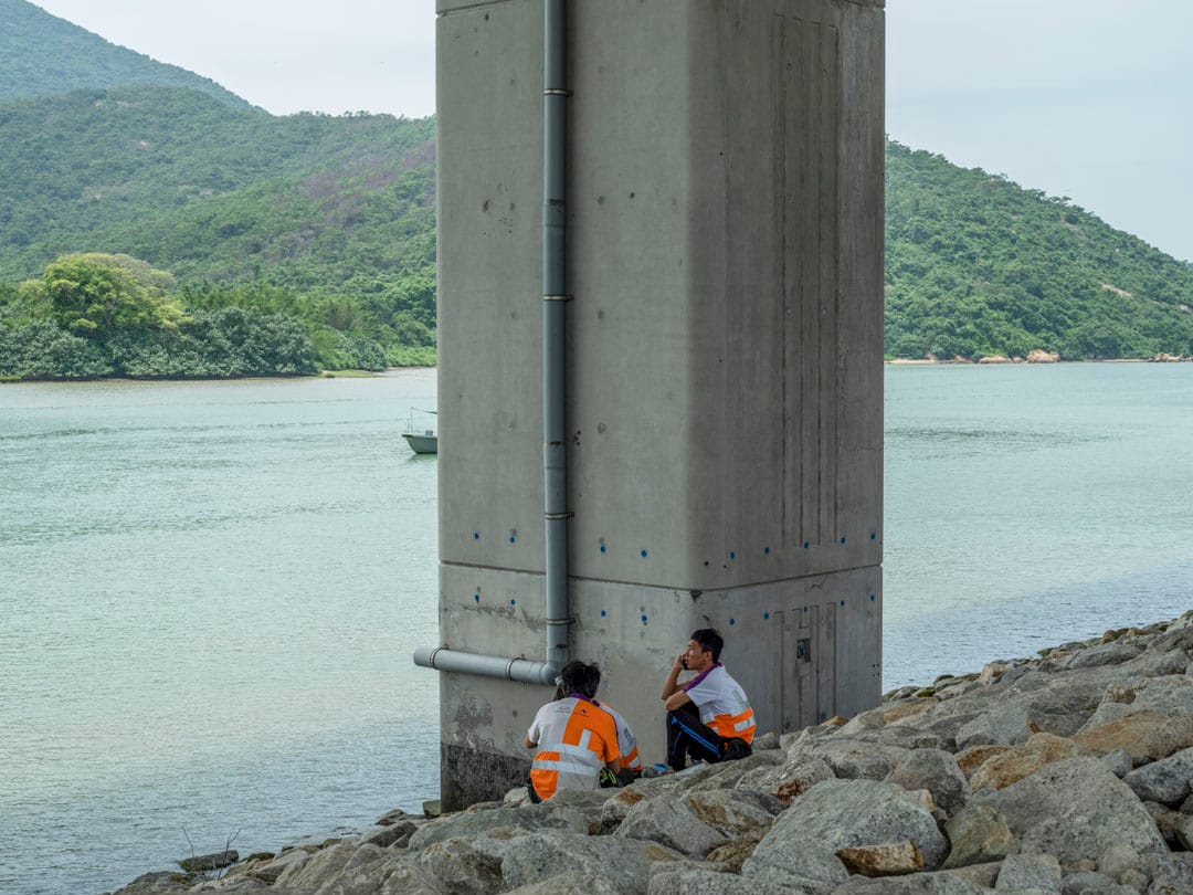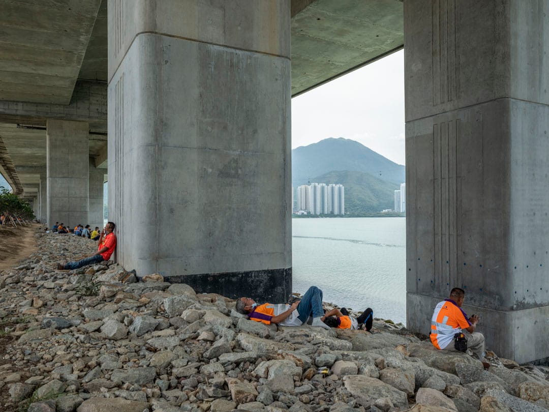 每逢中午12時,香港赤鱲角海岸便會湧現一點點螢光色的人影。港珠澳大橋從這裏起始,離開大嶼山橫跨海峽,穿過海洋,抵達珠海和澳門。車輛在上頭全速前進,橋下,身穿反光衣的建築工人各自佔據一塊舒適的陰影。他們在大嶼山山巒對面吃飯、抽煙、談天和看電話,甚至累得忘記脫下安全帽,席地而睡。