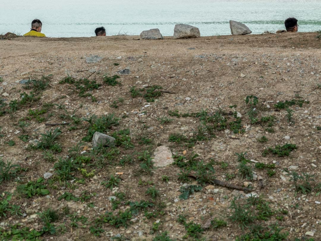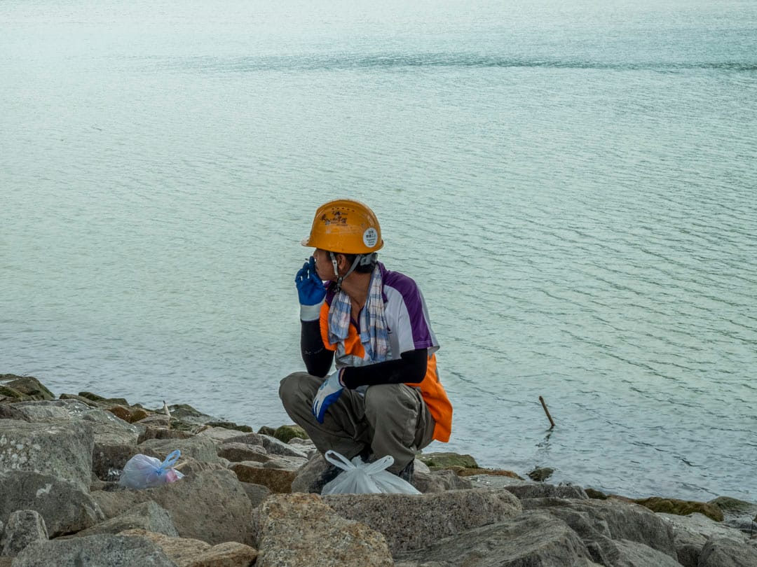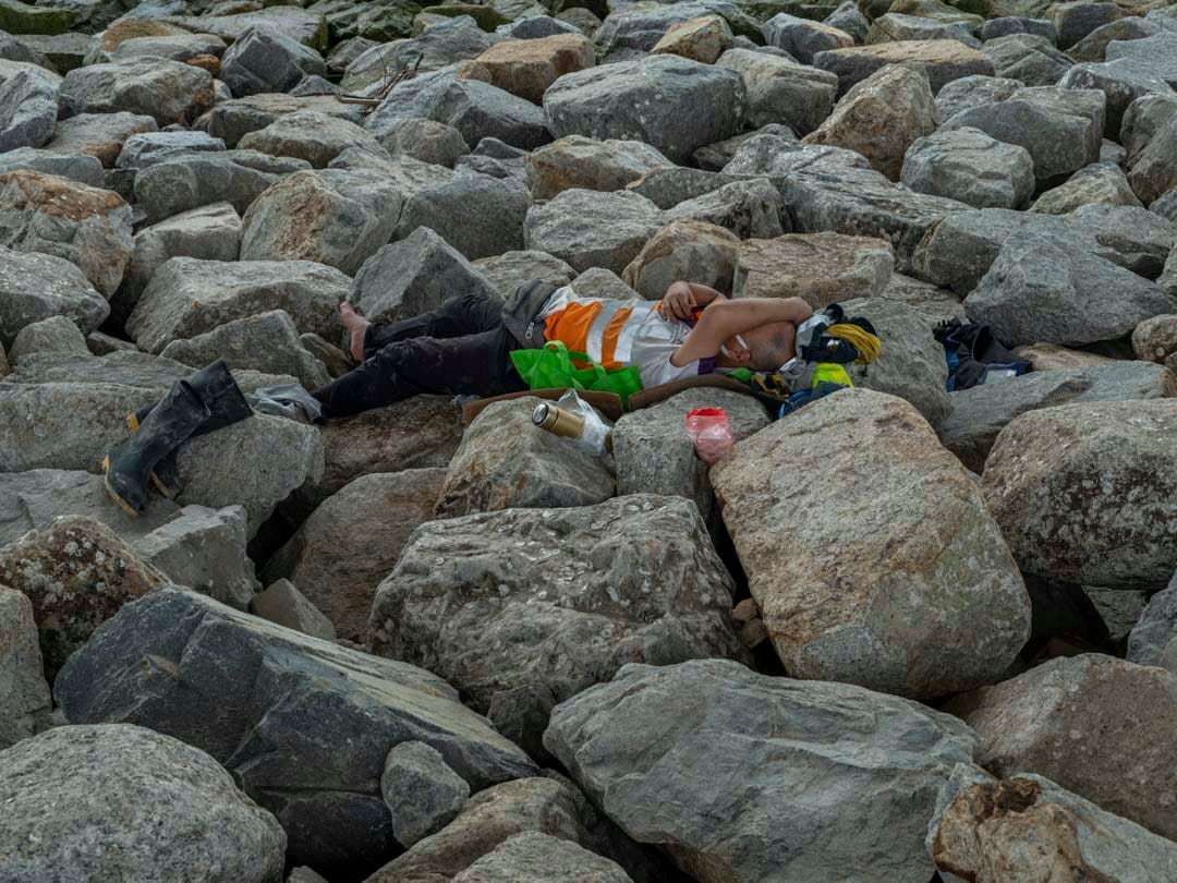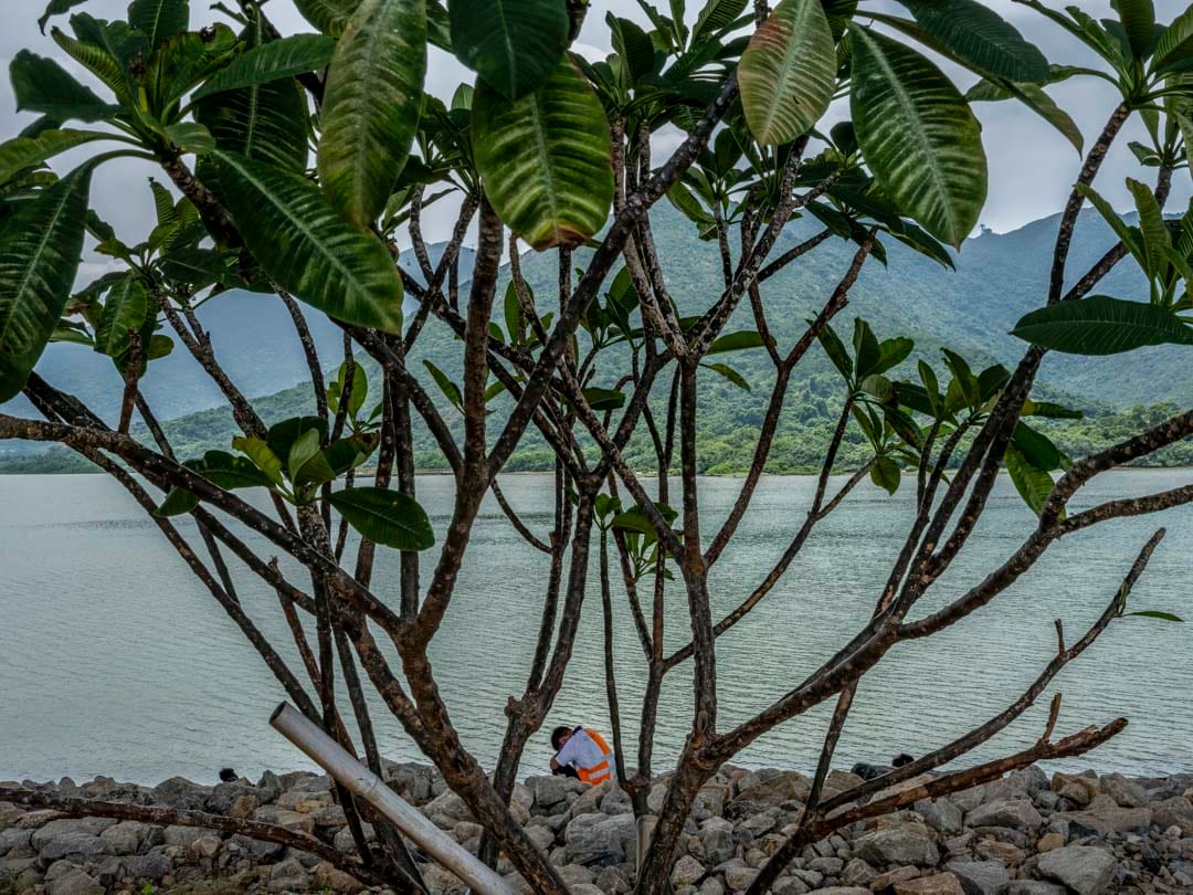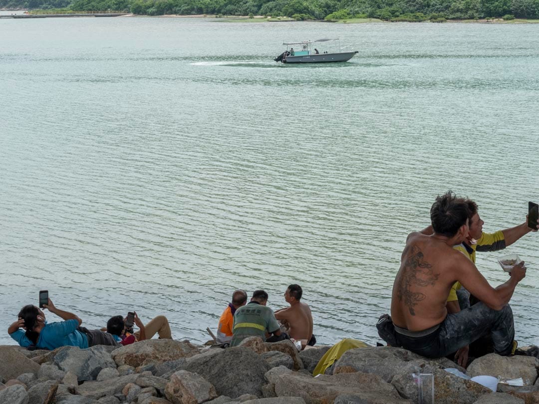 每逢中午12時,香港赤鱲角海岸便會湧現一點點螢光色的人影。港珠澳大橋從這裏起始,離開大嶼山橫跨海峽,穿過海洋,抵達珠海和澳門。車輛在上頭全速前進,橋下,身穿反光衣的建築工人各自佔據一塊舒適的陰影。他們在大嶼山山巒對面吃飯、抽煙、談天和看電話,甚至累得忘記脫下安全帽,席地而睡。