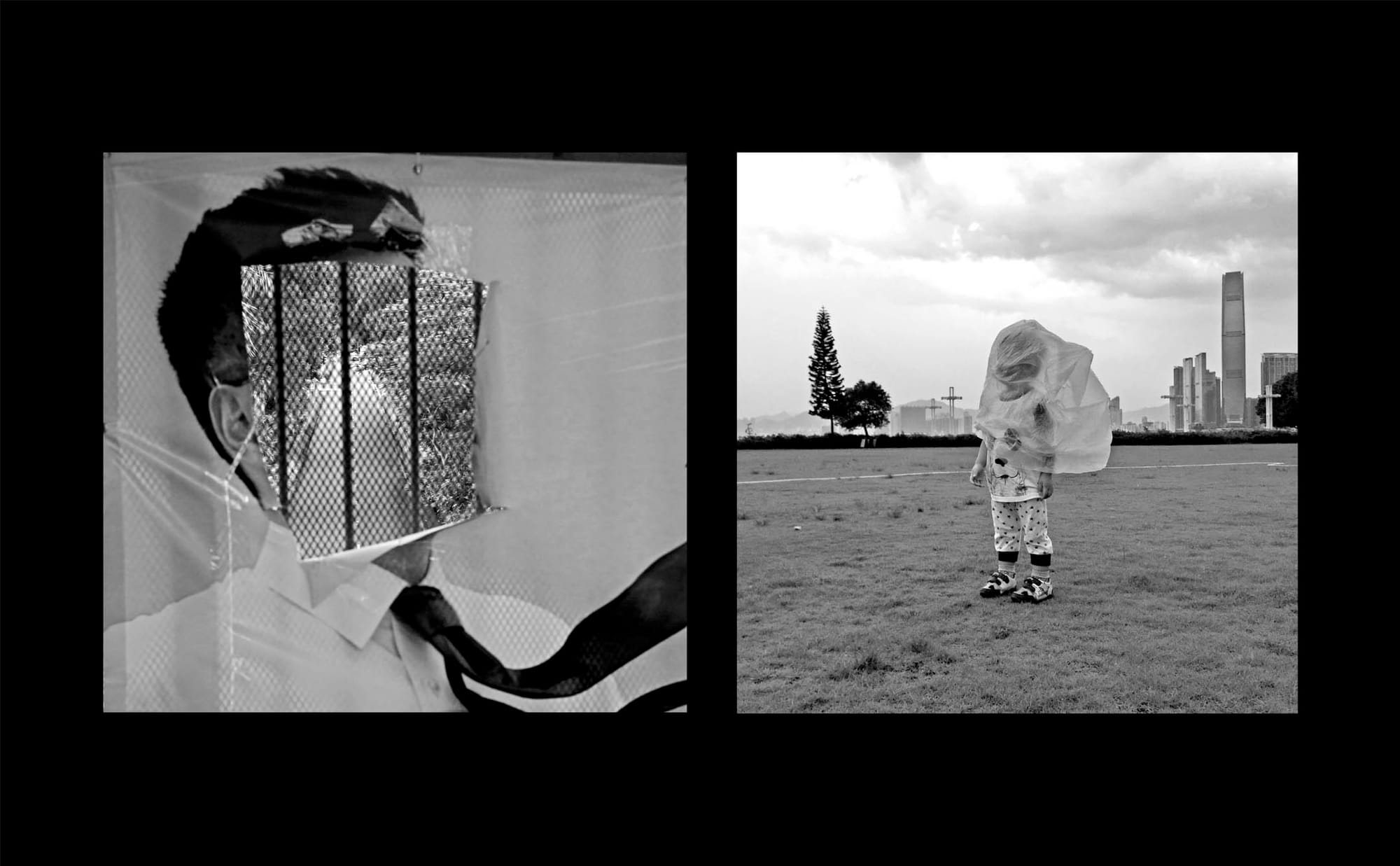 照片是源自2022年疫情下的一个计划⸺“新冠新观”的“下回分解”联展。概念来自卡 夫卡的《变形记》的一句:“早上起床发觉自己变成虫。”疫情突然降临,我们的身份亦 顿时产生变化,我邀请数位朋友穿戴虫的道具后拍摄及访问,像是超现实的特摄片。人 物是小咪(也是制作虫的道具的戏偶师)和她丈夫 WF CHAN,地点是大埔。
