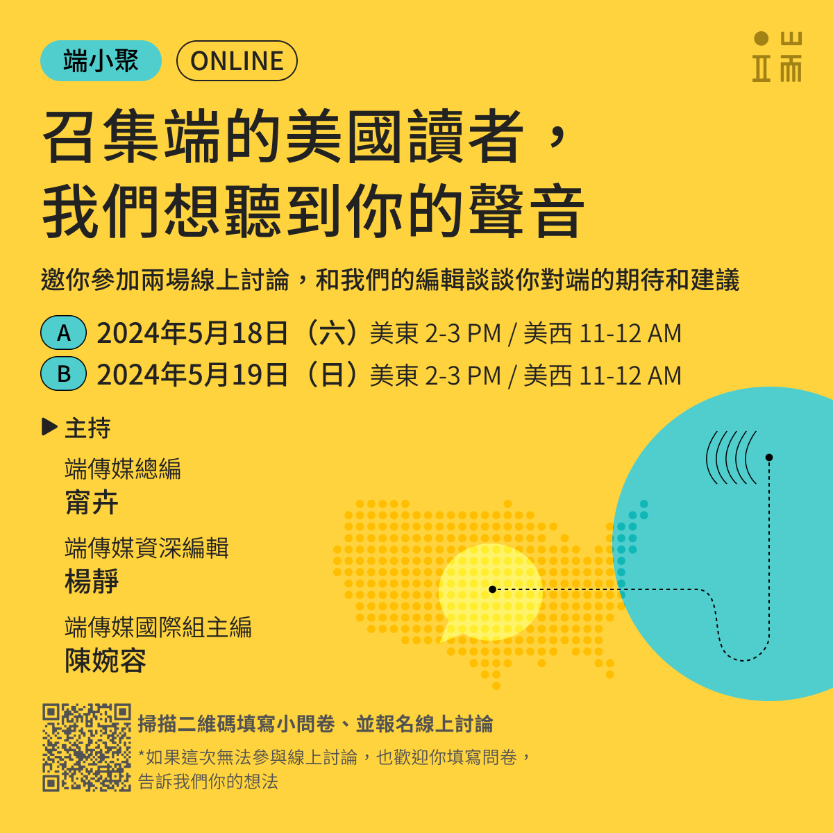 因此,這一期的端小聚,我們特別設計了一份調查問卷和兩場線上討論會,邀請生活在美國的讀者參加討論,和我們的編輯見面,聊聊你的新聞需求和對我們的期待。