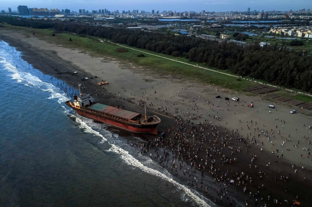 2024年8月3日,台南, 多哥籍貨輪蘇菲亞號受颱風凱米影響擱淺於台南黃金海岸沙灘,吸引不少民眾前往觀看。攝:陳焯煇/端傳媒
