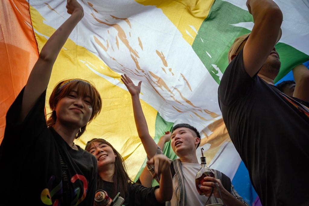 而因兩岸同婚政策開放引起的國安討論,以及近期對於跨性別者「免術換證」的爭議,都成為本次同志遊行「共融」景象下湧動的暗潮。雖然相對於往年自製標語數量不多,但在彩虹旗海中,仍可見教會、跨性別、香港旗幟飄蕩。