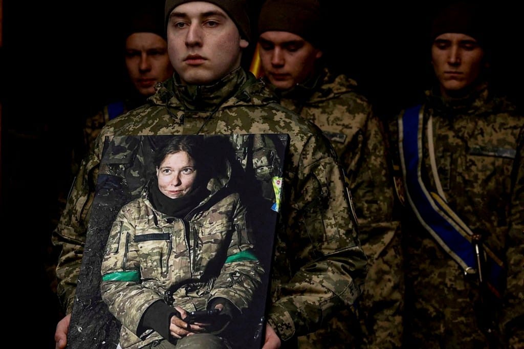2024年2月14日,一名乌克兰军人手举德国战地军医 Diana Savita Wagner 的肖像,她作为志愿者加入了乌克兰武装部队,并在俄罗斯攻击乌克兰期间在该国东部被俄罗斯军队杀害。摄:Valentyn Ogirenko/Reuters/达志影像