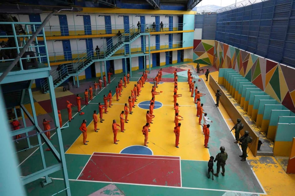 2024年2月22日,厄瓜多尔拉塔昆加,在军方组织的新闻发布会上,士兵们在科托帕西监狱站岗,囚犯们则正进行锻炼。摄:Dolores Ochoa/AP/达志影像