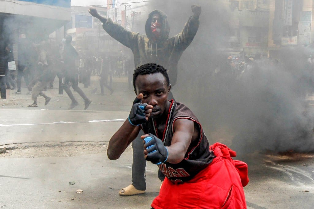 2024年7月2日,肯亚内罗毕,一名示威男子抗议警察杀害抗议民众,期间做出手势。摄:Monicah Mwangi/Reuters/达志影像