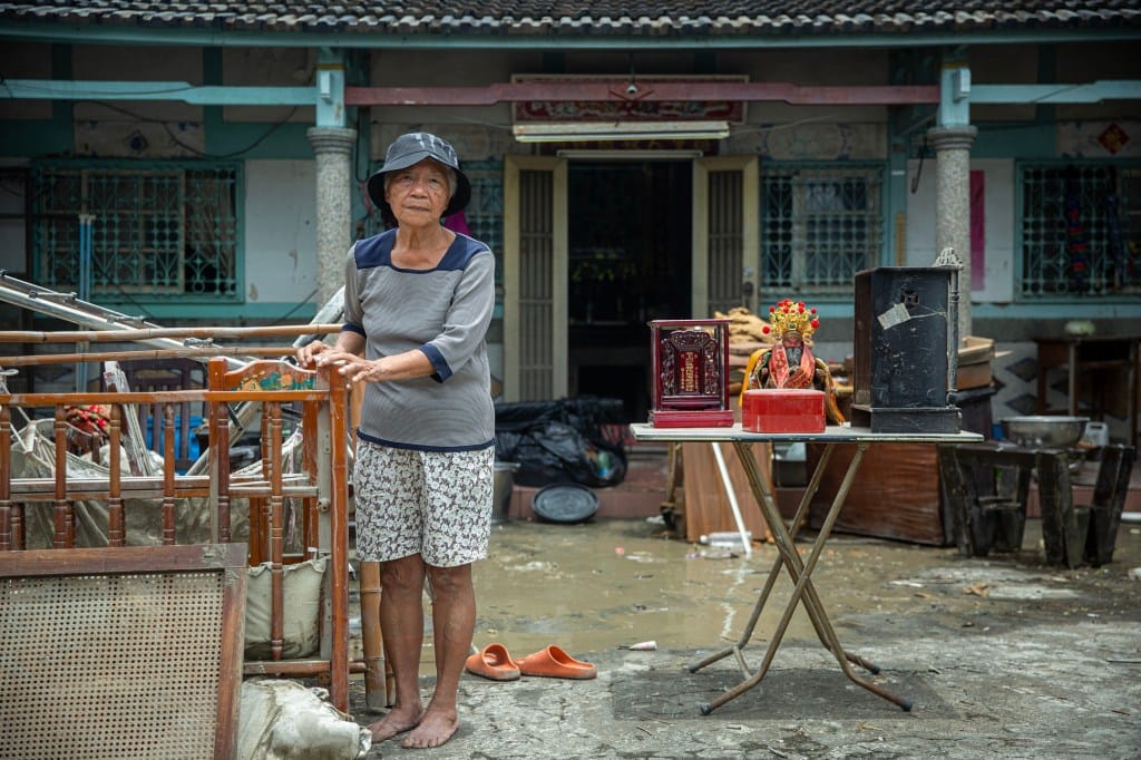 2024年7月27日,嘉义水上乡,台湾八年来再有强台凯米登陆,带来的巨量雨势仍造成台湾中南部地区多处水患,一位老人在自己的家门前,她的家因淹水而损坏,神像暂时放置屋外。摄:陈焯煇/端传媒