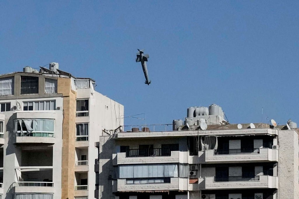 2024年10月22日,以军于社交媒体上发文警告指因打击真主党,两座建筑物被列为目标。40分钟后,一枚导弹击中其中一座公寓楼。美联社现场记者 Bilal Hussein 拍摄的照片捕捉到导弹击毁公寓大楼的瞬间。摄:Bilal Hussein/AP/达志影像