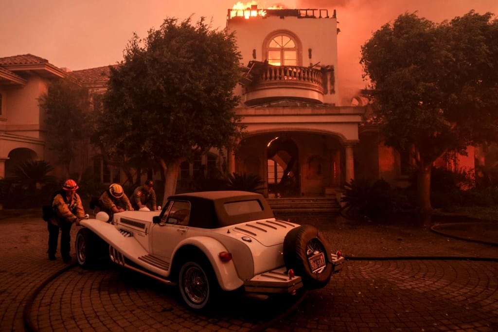 2024年11月6日,美国加州卡马里奥山火冒出浓烟,救援人员在一间屋前将一辆老式汽车推离现场。摄:David Swanson/Reuters/达志影像
