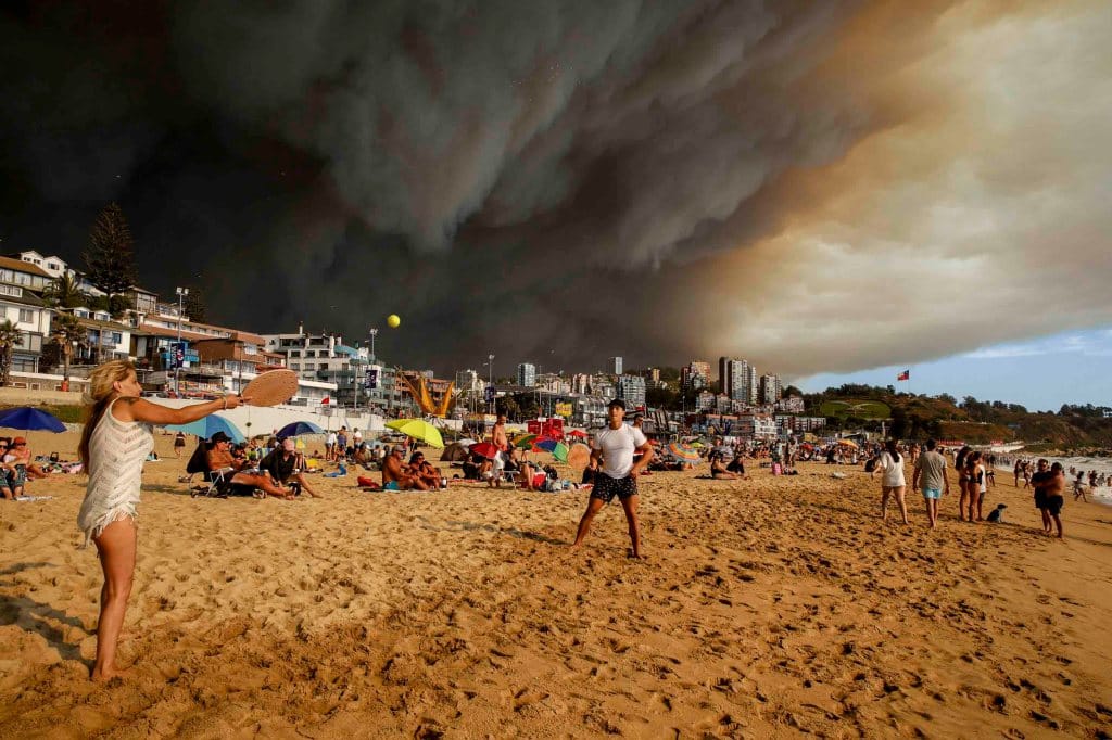 2024年2月2日,智利维涅马尔海滩,森林大火的烟雾正在逼近玩沙滩球的假日游客。摄:Martin Thomas/Aton Chile via AP/达志影像