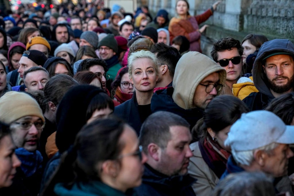 2024年3月17日,德国柏林,俄罗斯反对派呼吁民众在总统选举最后一天的中午前往投票站,对几乎可以确定将延长总统普丁执政期的选举以示抗议,此前他曾对异议进行镇压。中午过后俄罗斯大使馆外,Yulia Navalnaya(Alexey Navalny的遗孀)与其他选民排队往投票站投票。摄:Ebrahim Noroozi/AP/达志影像