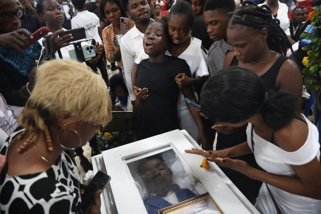 2024年5月25日,海地太子港,Saintus Leodens遭身份不明人士袭击后丧生,亲属在安葬仪式聚集在他的灵柩旁,致上最后的敬意。摄:Odelyn Joseph/AP/达志影像