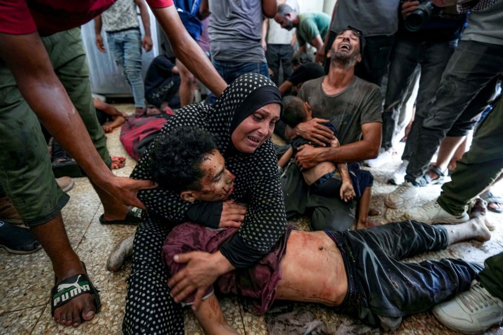 2024年8月28日,加沙走廊德尔巴拉,Faten Mreish在医院的停尸间抱著她儿子的遗体,他与其他人在以色列的轰炸中丧生。摄:Abdel Kareem Hana/AP/达志影像