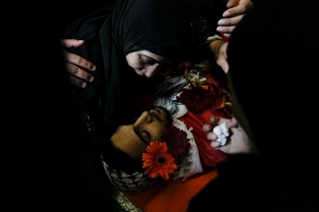 2024年7月24日,约旦河西岸Qalandiya难民营,Ahmed Nidal在与以色列军队的冲突中丧生,他的母亲在葬礼上哀悼他的遗体。摄:Mahmoud Illean/AP/达志影像