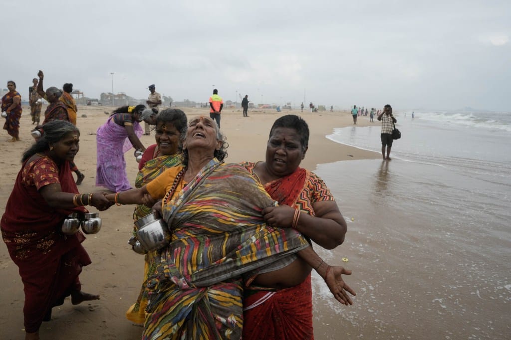 2024年12月26日,南亚海啸20周年,印度清奈游艇码头海滩,一名印度妇女悼念罹难者时放声痛哭。摄:Mahesh Kumar A./AP/达志影像