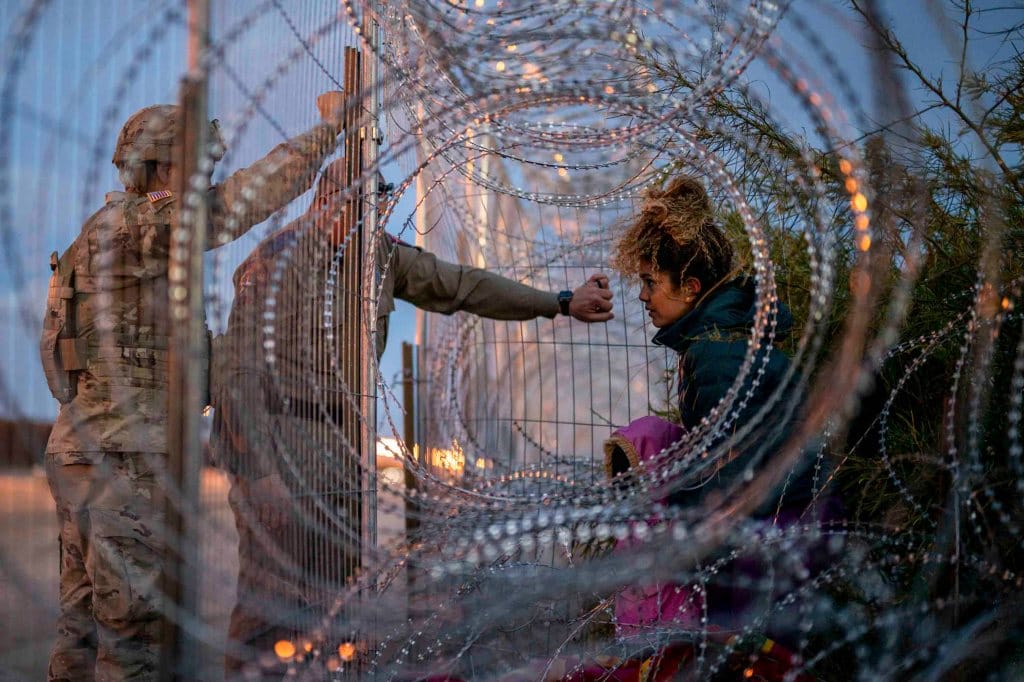 2024年3月26日,来自委内瑞拉的22岁移民Eliana抱著她3岁的女儿Crismarlees,试图从美国一侧穿过格兰德河的铁丝网时被拒入境。摄:Brandon Bell/Getty Images