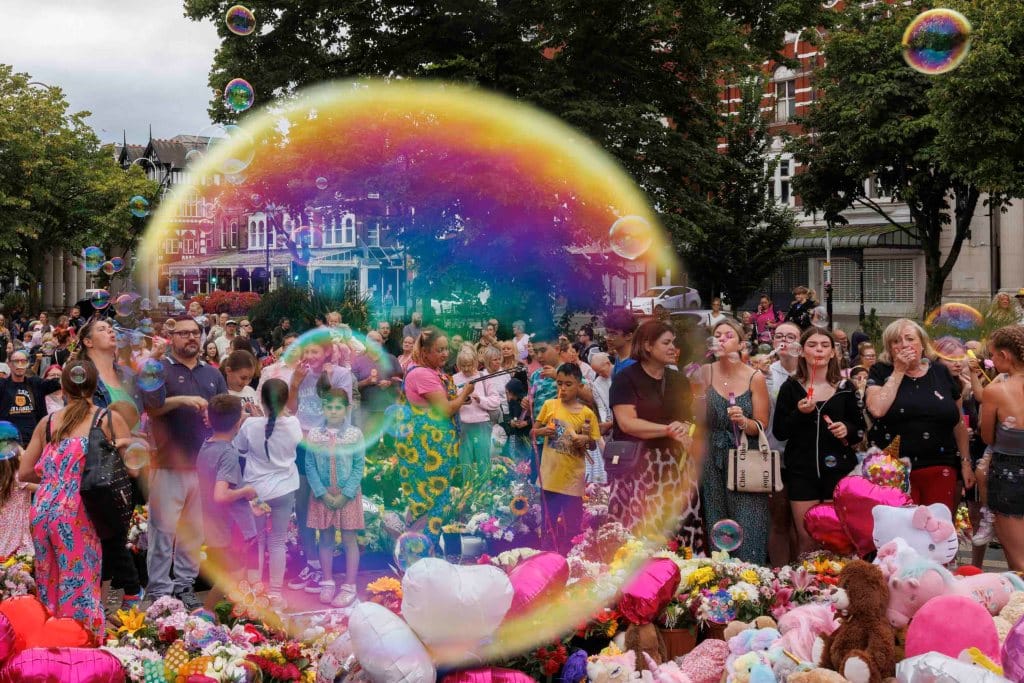2024年8月5日,英国南港的守夜活动中,社区成员吹泡悼念持刀袭击事件的受害者。一周前,三位不足10岁的小孩在以Taylor Swift为主题的舞蹈课上,被17岁的Axel Muganwa Rudakubana刺杀身亡,另有数人重伤。事件以及嫌疑人是移民的虚假信息广泛流传,亦引发了全英国的连串反移民抗议和暴动。摄:Dan Kitwood/Getty Images