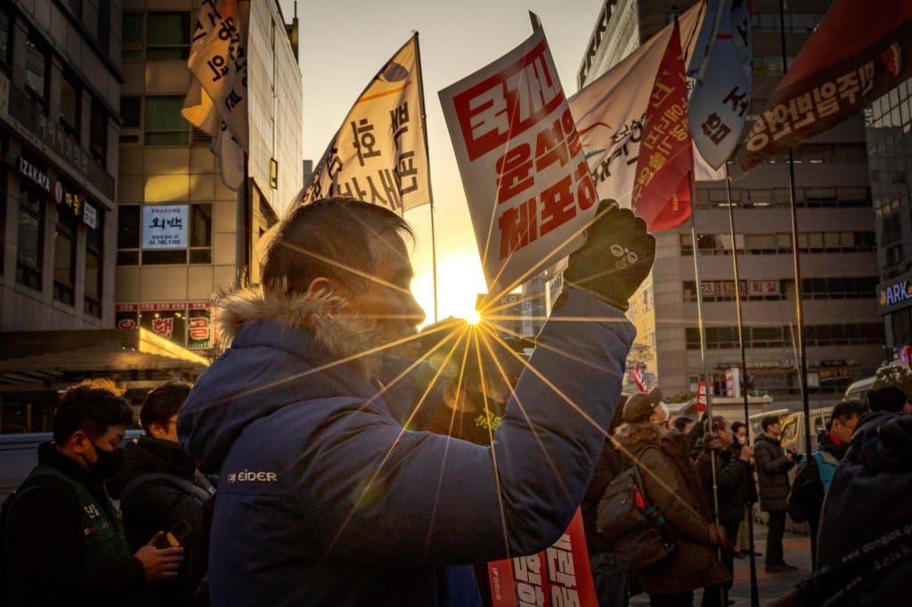2024年12月6日,韩国首尔,抗议者在执政的国民力量党总部外举行示威反对总统尹锡悦。早前尹锡悦总统宣布紧急戒严,指控反对党破坏治理并同情朝鲜,这项决定在国会以190票全票反对被撤销。摄:Ezra Acayan/Getty Images