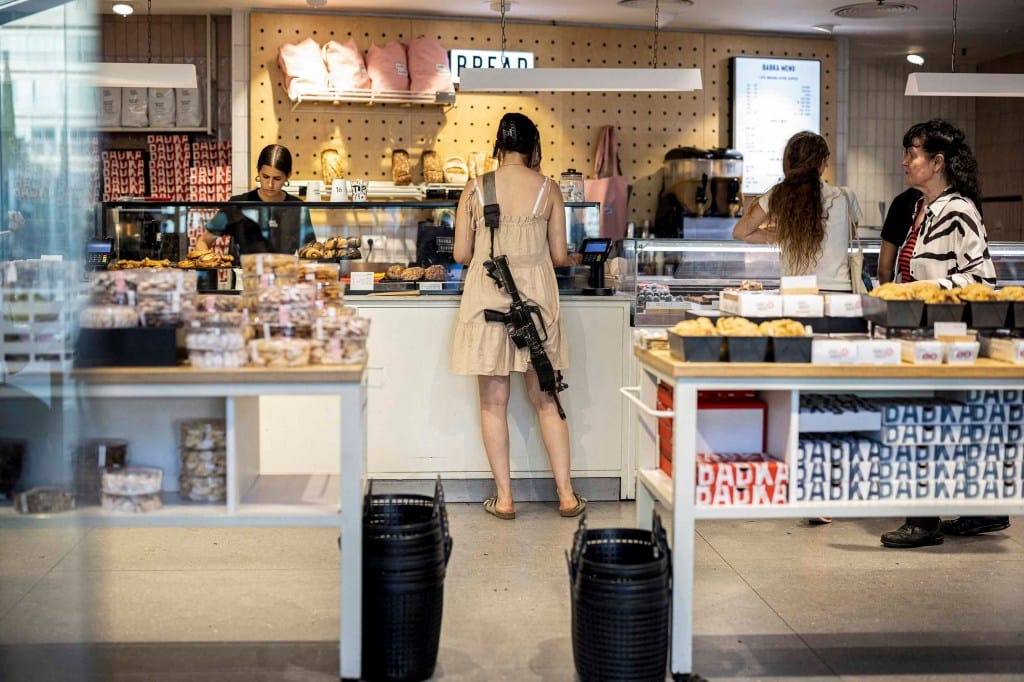 2024年6月4日,以色列特拉维夫,一名女子背挂步枪在面包店购物。摄:Marko Djurica/Reuters/达志影像