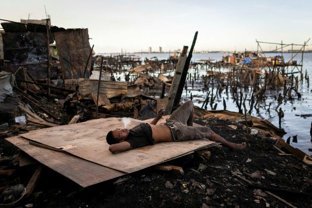 2024年11月26日,菲律宾马尼拉汤都的贫民区,一名男子在重建被大火烧毁的家时抽烟休息片刻。摄:Eloisa Lopez/Reuters/达志影像