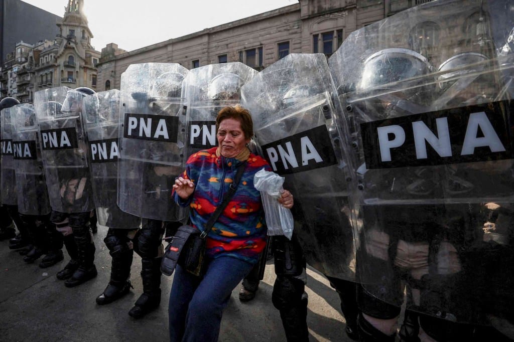 2024年9月11日,阿根廷布宜诺斯艾利斯,国会大厦外一场抗议总统Javier Milei否决养老金改革决定的活动中,一名女子站在阿根廷警察旁。摄:Agustin Marcarian/Reuters/达志影像