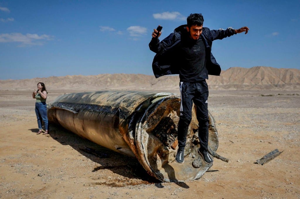 2024年10月2日,以色列南部城市阿拉德附近的沙漠,一名男子从疑似伊朗攻击以色列后遗留的弹道导弹残骸上跳下。摄:Amir Cohen/Reuters/达志影像