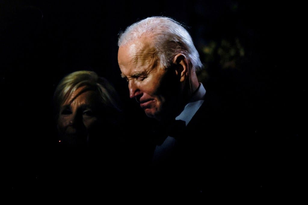 2024年11月22日,美国华盛顿白宫南草坪,美国总统拜登在晚宴上与第一夫人Jill Biden举杯致词时情绪激动。摄:Annabelle Gordon/Reuters/达志影像