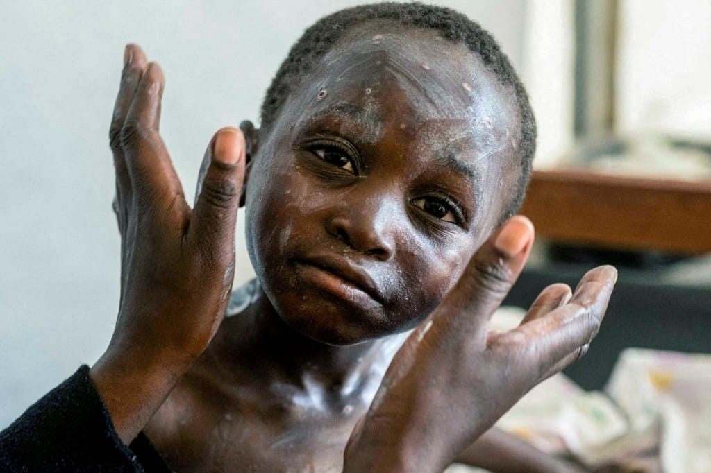 2024年8月19日,刚果民主共和国北基伍省,母亲Furaha Elisabeth正为孩子Sagesse Hakizimana的皮肤涂抹药物,以治疗猴痘。摄:Arlette Bashizi/Reuters/达志影像
