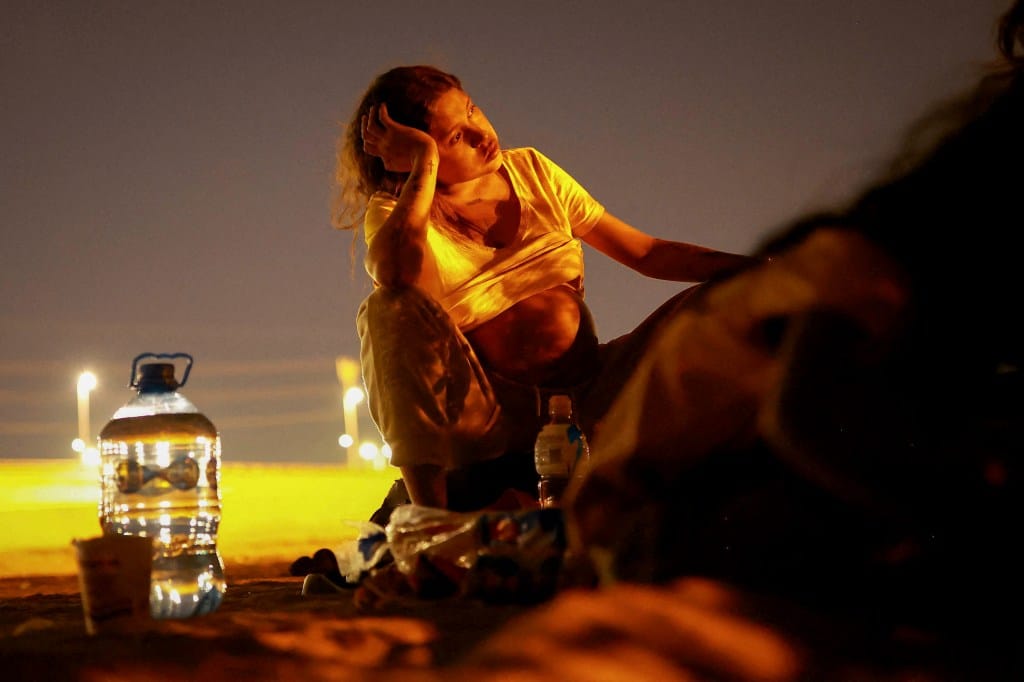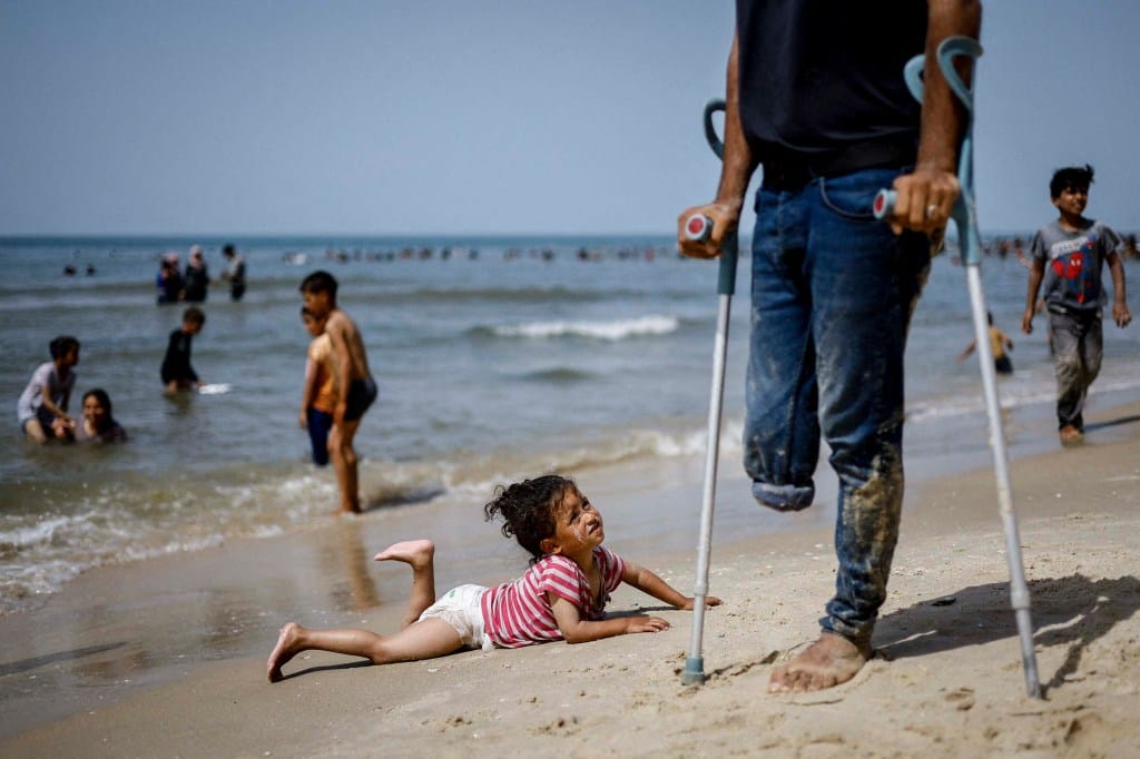 2024年4月24日,加沙南部拉法,一位小孩看著巴勒斯坦人在炎热天气下享受海滩。摄:摄:Mohammed Salem/Reuters/达志影像