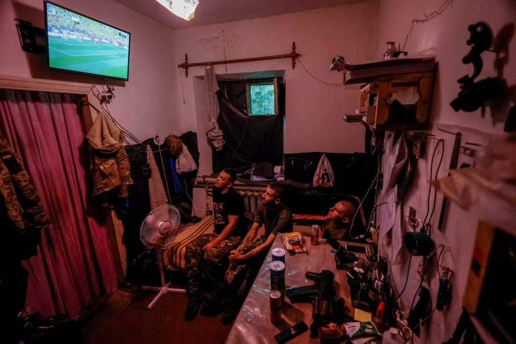 2024年6月17日,乌克兰顿涅茨克前线,乌克兰军人正在观看国家队对阵罗马尼亚的欧洲足球锦标赛(Euro 2024)。摄:Alina Smutko/Reuters/达志影像