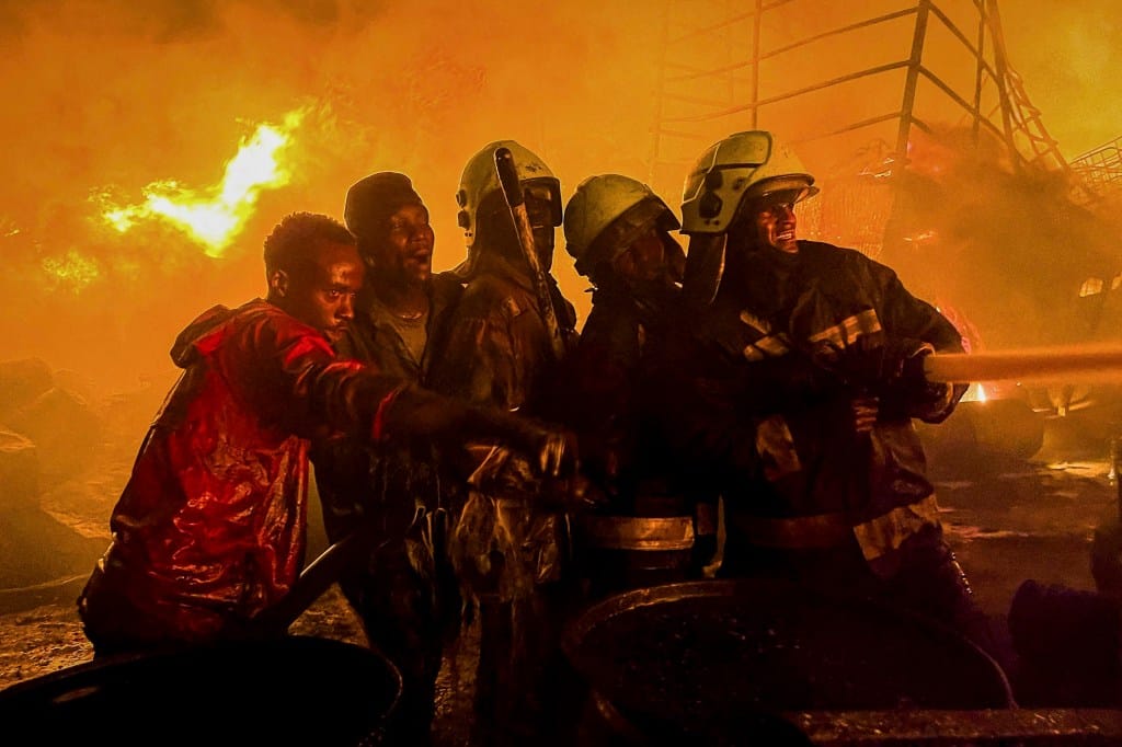 2024年1月28日,肯亚奈洛比,储存油桶和易燃容器的商务仓库大火,消防员和自愿者尝试扑灭火势。摄:Thomas Mukoya/Reuters/达志影像