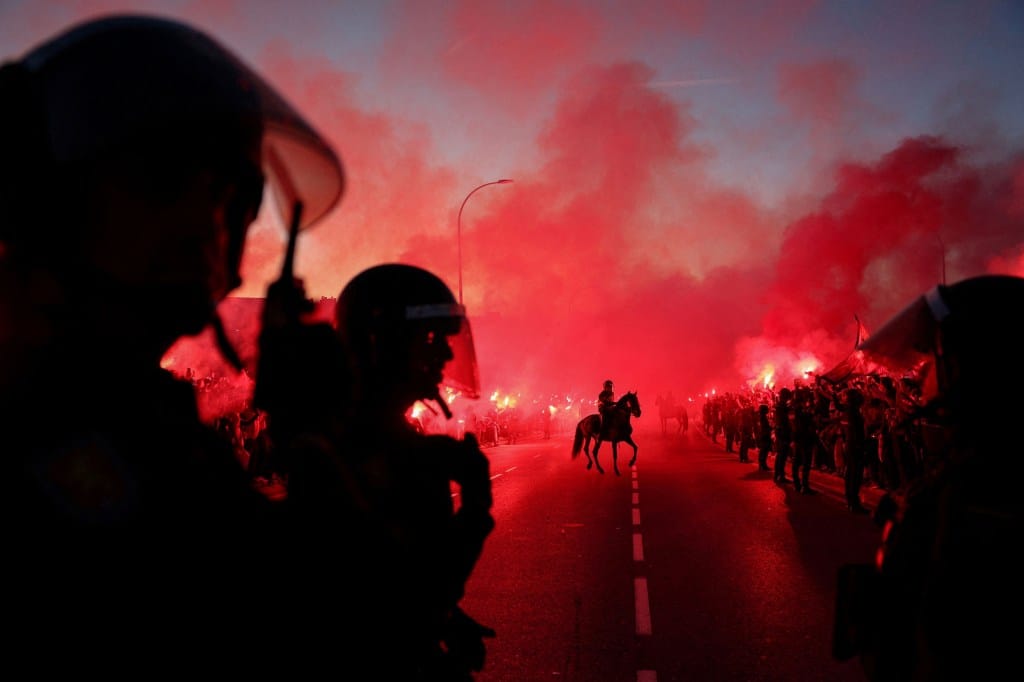 2024年3月13日,西班牙马德里,大都会球场,欧洲冠军联赛16强第二回合,马德里体育会对阵国际米兰的赛事开始前,警察在球场外骑马巡逻。摄:Violeta Santos Moura/Reuters/达志影像