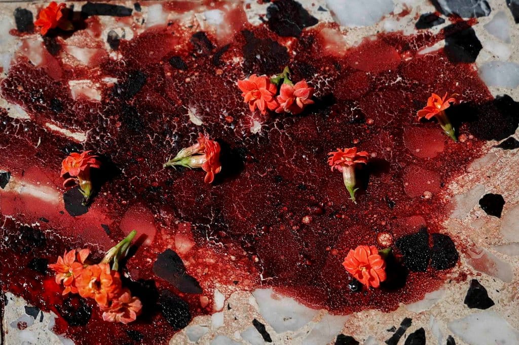 2024年4月4日,以色列占领的约旦河西岸城镇Yaabad,巴勒斯坦人Asaad al-Qaniri在以色列突袭中被杀害的现场,房屋地板带有血迹的地方摆放著鲜花。摄:Raneen Sawafta/Reuters/达志影像
