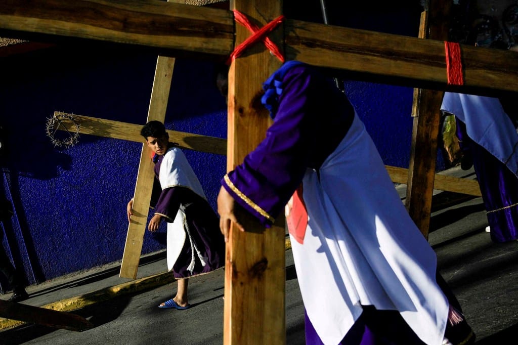 2024年3月29日,墨西哥墨西哥城,圣周期间,民众背负木制十字架参与耶稣受难日游行。摄:Raquel Cunha/Reuters/达志影像