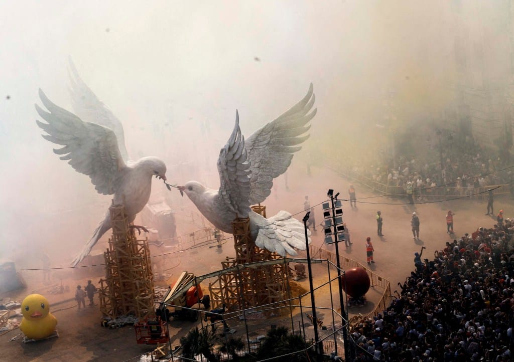 2024年3月15日,西班牙华伦西亚,Mascleta火炮表演烟雾弥漫,掩盖了艺术家Escif创作象征和平白鸽争夺橄榄枝的巨型雕像(Ninots)及市政广场建筑物。摄:Eva Manez/Reuters/达志影像