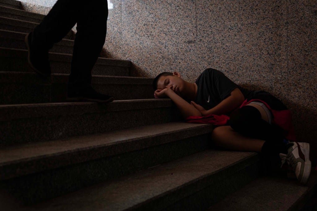 2025年5月3日,白沙屯妈祖进香,于中午抵达北港朝天宫,一名孩子睡在地上。摄:陈焯煇/端传媒“跟著妈祖婆进香,已经成了一种瘾了。”高小姐曾因车祸无法徒步参与,深刻体会行动不便之苦。自那时起,她便与妈祖立下约定,愿以车辆协助载送不便的香灯脚,用自己的方式,成为妈祖在人间的兵马。一路上,除了徒步的香灯脚,自发组成的医疗团、行动补给站也随行,提供充电、淋浴、物资等协助,当地居民也忙著以消暑的凉水、西瓜招呼香灯脚。落下的,能饮水歇息、修复劳损,体力不支的,能乘坐“累了请上车”的车辆。入夜后,则会见到工厂、商店、民宅纷纷亮灯,为香灯脚们提供住宿之所。