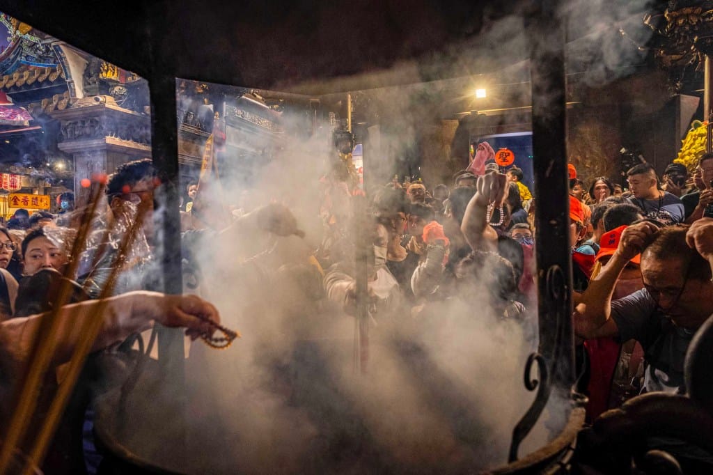 2025年5月3日,白沙屯妈祖进香,于中午抵达北港朝天宫,由苗栗白沙屯拱天宫起,妈祖銮轿约36小时抵云林北港,大批民众夹道欢迎。日夜兼程的信徒随妈祖抵达,人潮涌入寺庙,焚香祈福,据拱天宫统计,香灯脚报名人数突破32万。摄:陈焯煇/端传媒