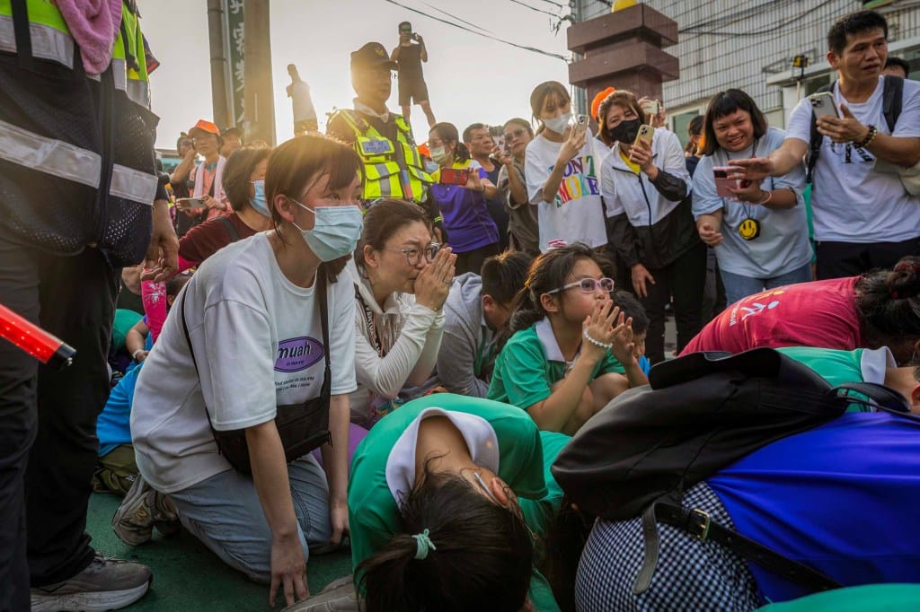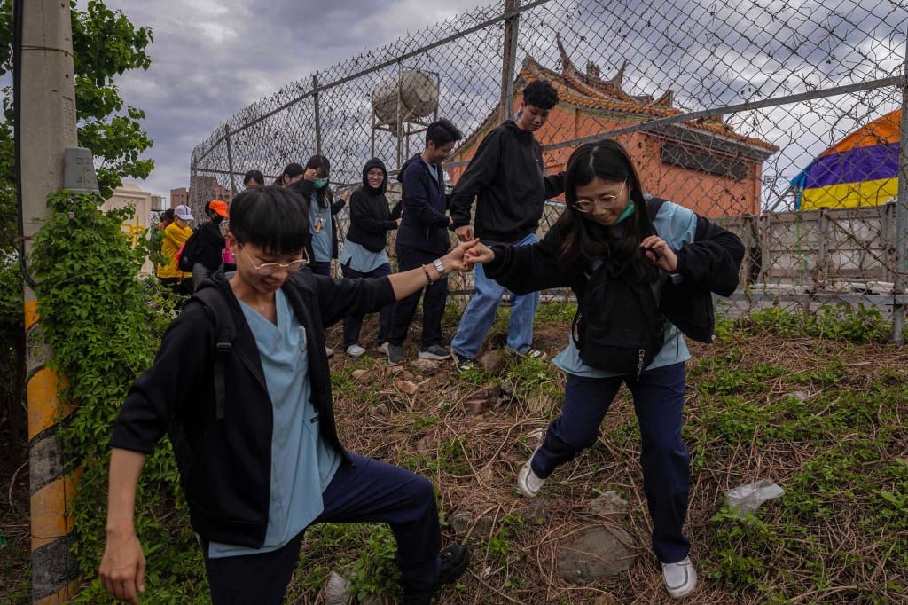 2025年5月9日,台中,学生们越过障碍,为追随白沙屯妈祖的路线。摄:陈焯煇/端传媒