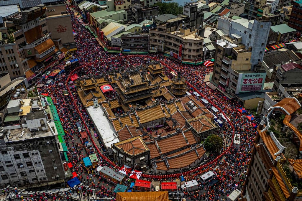 2025年5月3日,白沙屯妈祖进香,于中午抵达北港朝天宫,由苗栗白沙屯拱天宫起,妈祖銮轿迅速抵达云林北港,大批民众涌入庙内参香祈福。摄:陈焯煇/端传媒