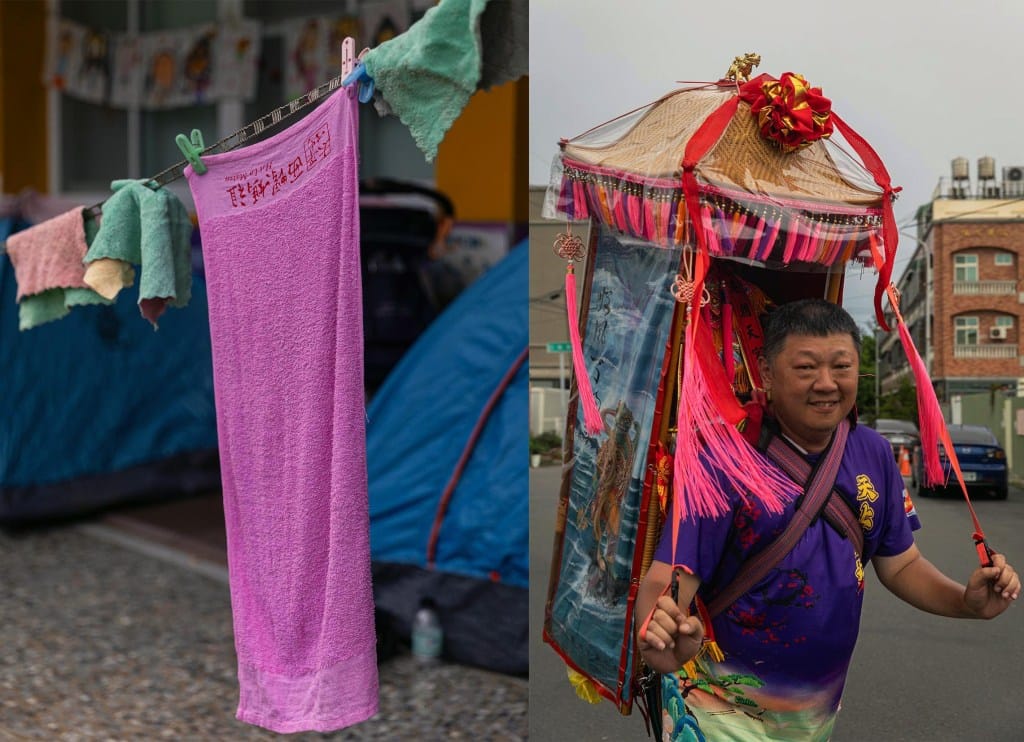 (左)2025年5月3日,北港,香灯脚的毛巾。(右)2025年5月9日,台中,一名背著神像追随白沙屯妈祖的信众。摄:陈焯煇/端传媒