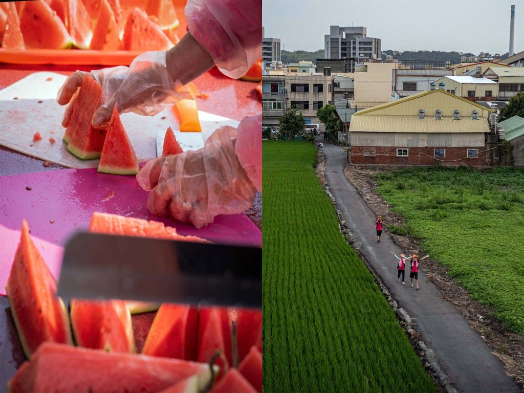 (左)2025年5月8日,彰化,追随白沙屯妈祖的信众走在路上。(右)2025年5月8日,彰化,民众预备西瓜给旅途上的香灯脚消暑。摄:唐佐欣/端传媒