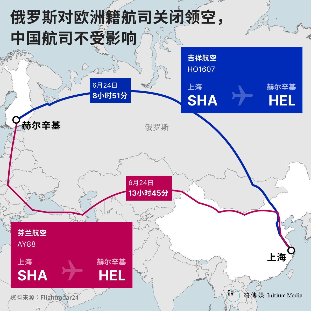 以6月24日上海飞赫尔辛基为例,中国吉祥航空HO1607直接飞越俄罗斯,接近球面上两点间最短距离的“大圆航线”,飞行时间为8小时51分钟;芬兰航空AY88则采南路绕开俄罗斯,飞行时间长达13小时45分钟,比吉祥航空的路线多出近五小时。