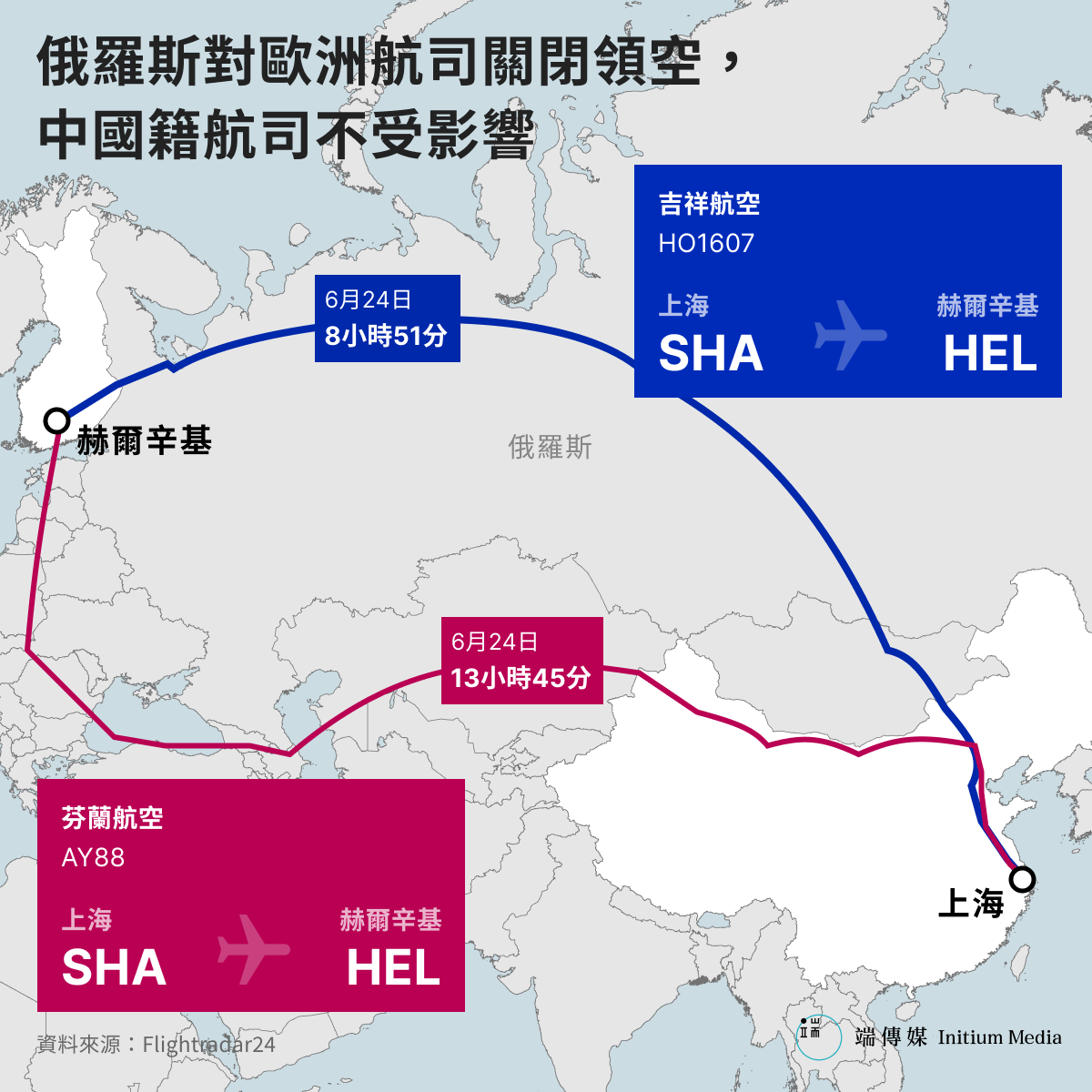 以6月24日上海飛赫爾辛基為例,中國吉祥航空HO1607直接飛越俄羅斯,接近球面上兩點間最短距離的「大圓航線」,飛行時間為8小時51分鐘;芬蘭航空AY88則採南路繞開俄羅斯,飛行時間長達13小時45分鐘,比吉祥航空的路線多出近五小時。