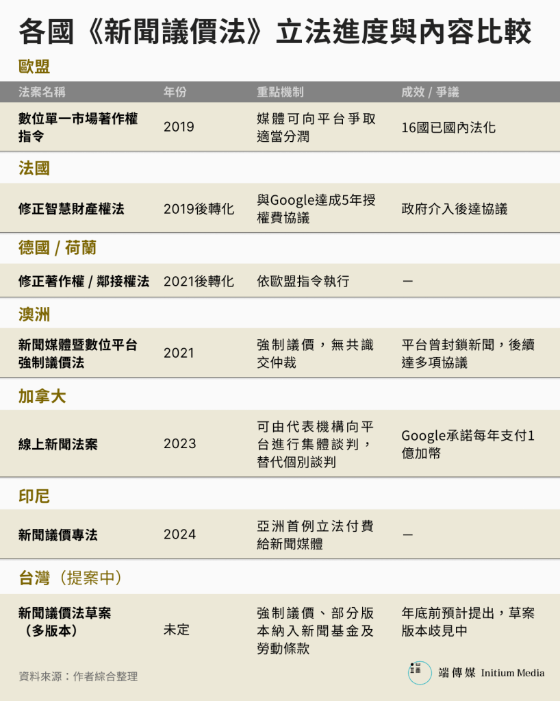 加拿大於2023年跟進,通過《線上新聞法案》(Online News Act),要求最大型的數位平台與新聞業者公平議價。印尼則在2024年設立專法,成為亞洲第一個立法要求Google、Meta等平台付費給新聞媒體的國家。